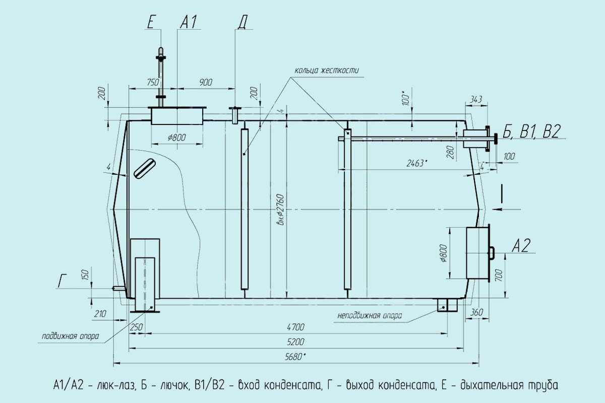 Резервуар укомплектован клапанами входа и выхода конденсата, дыхательной трубкой, вмонтированной в верхний люк-лаз, уровнемером, задвижками слива, технологическим лючком. Конструкция укреплена кольцами жесткости. Возможна разработка проекта по требованию заказчика с изменением длины и диаметра корпуса, с сохранением объема 30 м³.